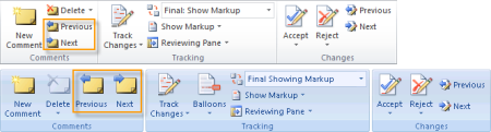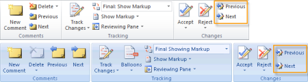 On the Review tab, in the Changes group, click Next or Previous.