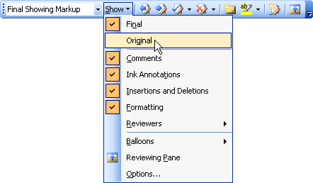 On the Reviewing toolbar, click Show, and then click Original.